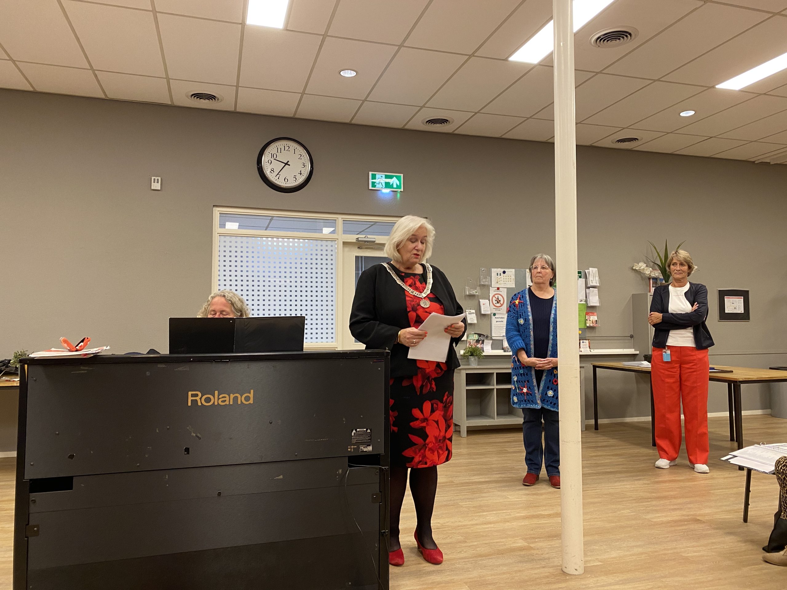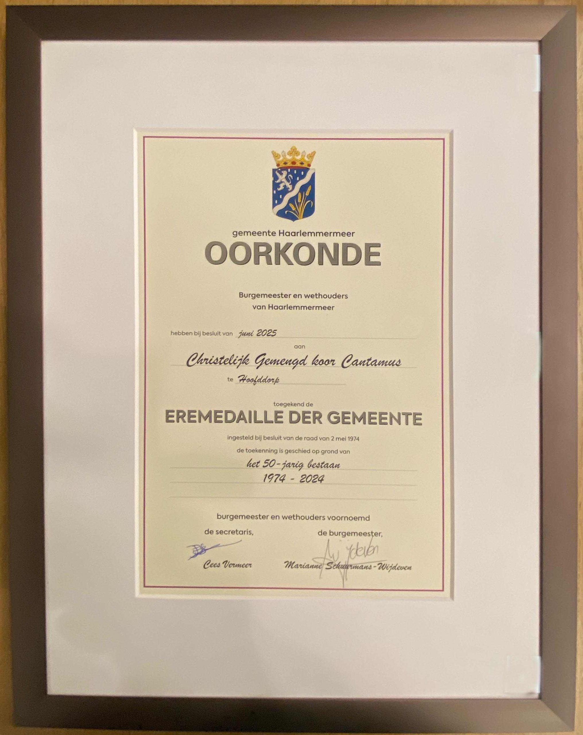 Dinsdagavond, 30 september 2025, werden we tijdens de repetitie verrast met een bezoek van Mw. Schuurmans, burgermeester van de Haarlemmermeer. I.v.m. ons 50 jarig jubileum kregen wij de Erepenning van De Haarlemmermeer uitgereikt. Een grote verrassing.